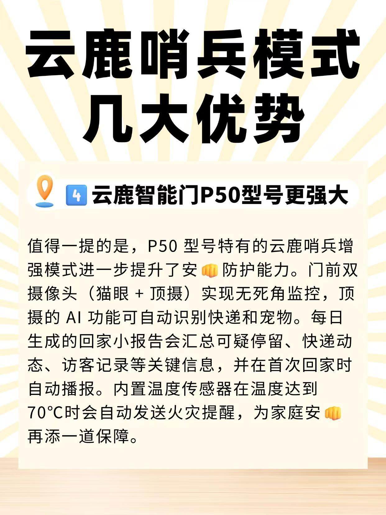 4、云鹿智能门P50型号更强大值得一提的是,P50型号特有的云鹿哨兵增强模式进一步提升了安咖防护能力。门前双摄像头(猫眼+顶摄)实现无死角监控,顶摄的A功能可自动识别快递和宠物。每日生成的回家小报告会汇总可疑停留、快递动态、访客记录等关键信息,并在首次回家时自动播报。内置温度传感器在温度达到70℃时会自动发送火灾提醒,为家庭安咖再添一道保障。